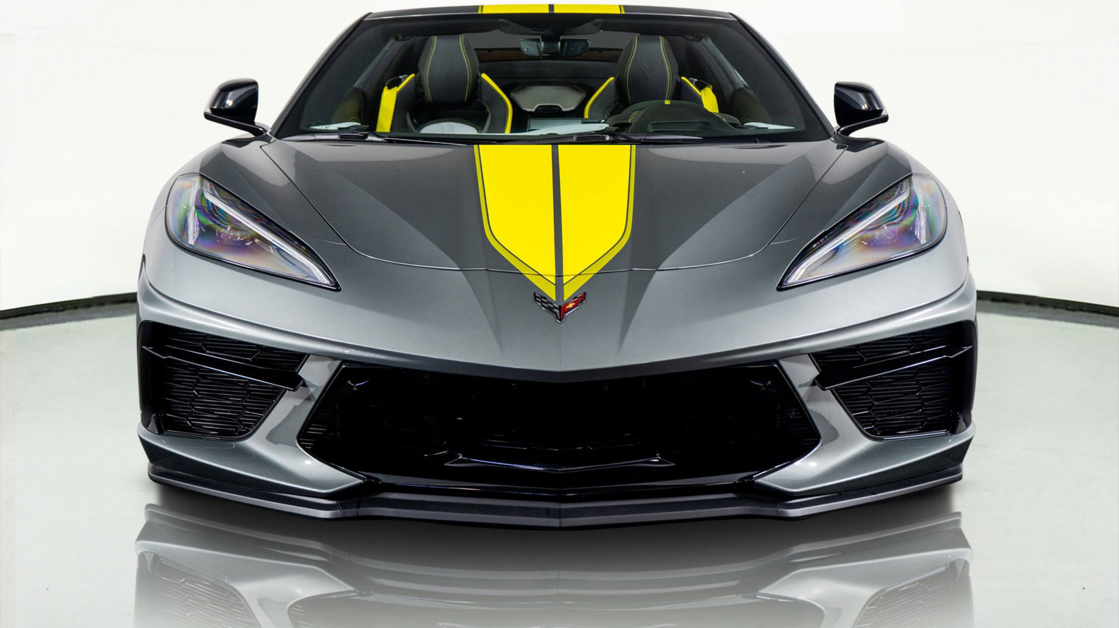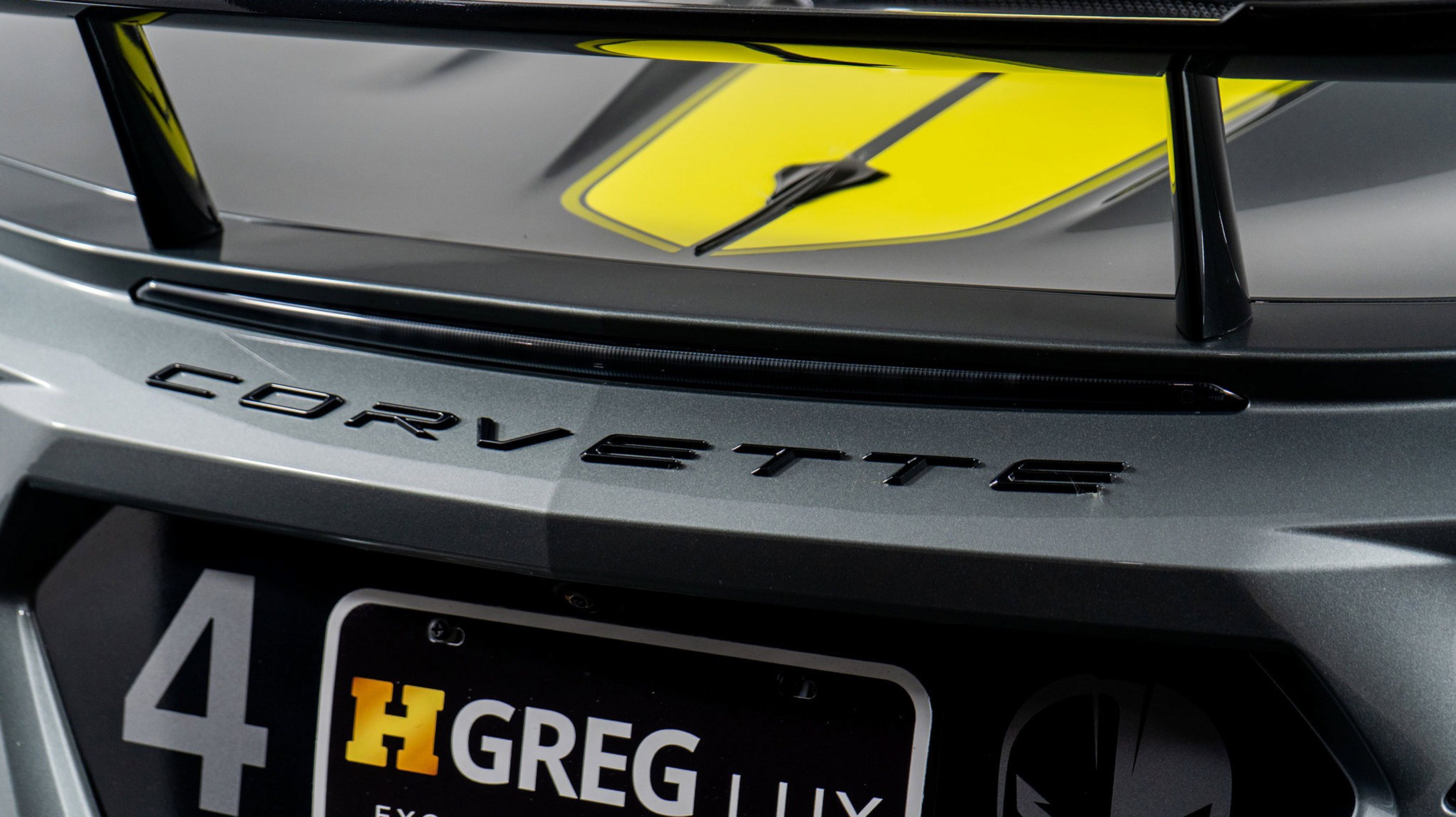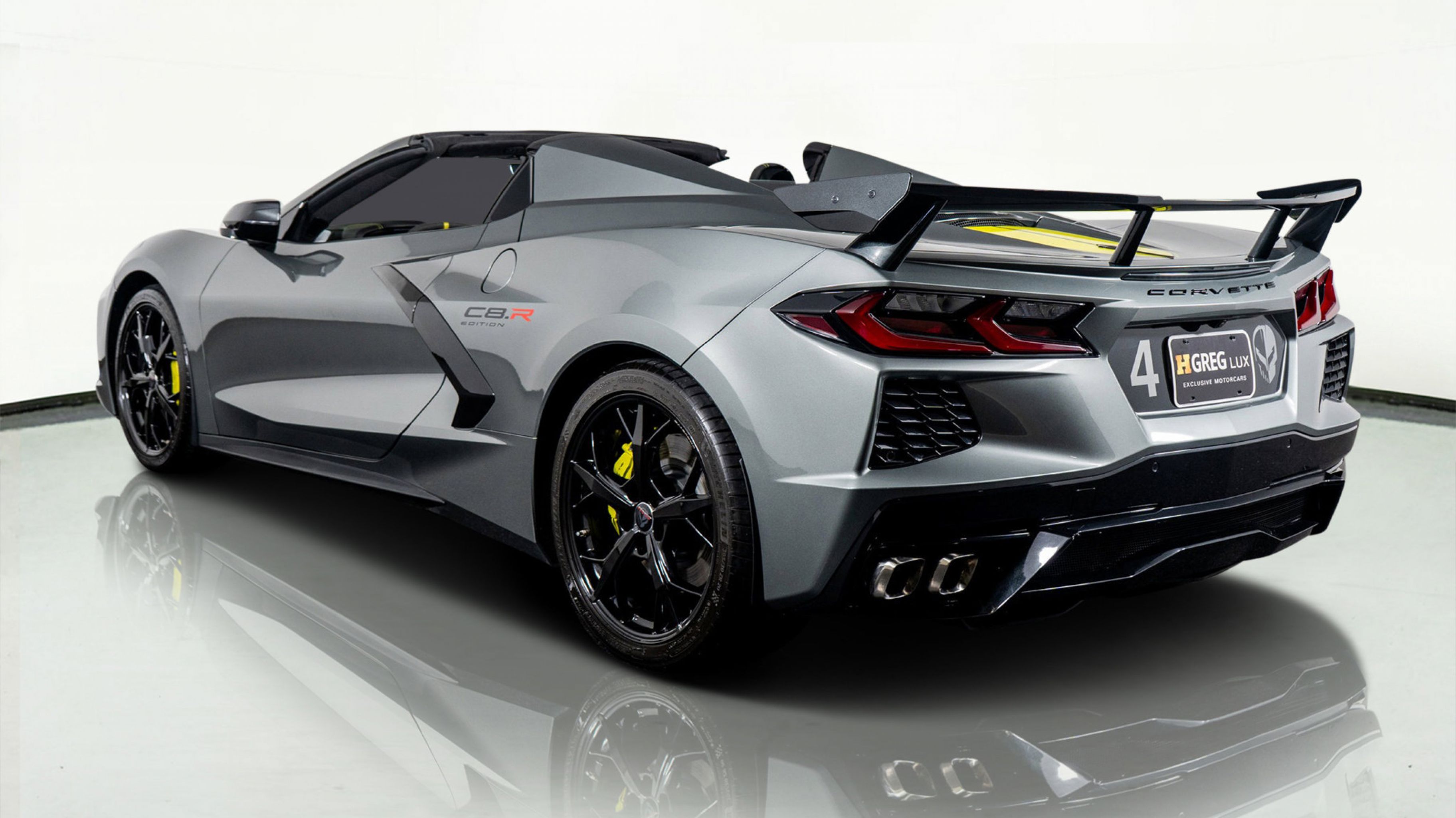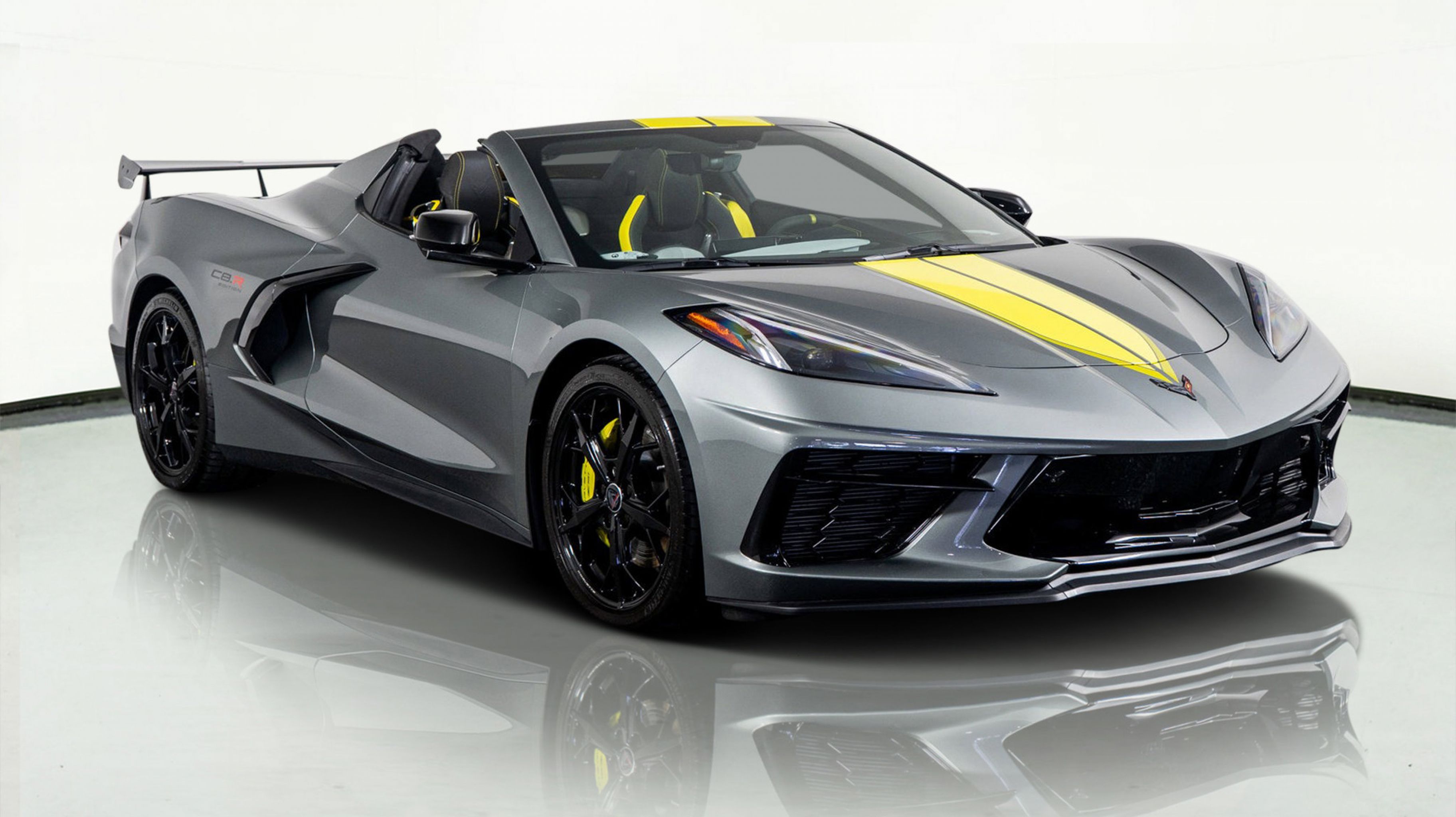- IMSA GTLM CHAMPIONSHIP C8.R EDITION includes Yellow C8.R Graphics Package [when ordered with (GA7) Hypersonic Gray Metallic exterior color] or Gray C8.R Graphics Package [when ordered with (GD0) Accelerate Yellow Metallic exterior color] (CFY) C8.R Special Edition numbered plaque (ZYC) Carbon Flash Metallic-painted outside mirrors (QE5) 19 front/20 rear 5-trident-spoke Black-painted aluminum wheels (J6E) Edge Yellow-painted calipers (N26) sueded-microfiber steering wheel the following Genuine Corvette Accessory LPOs: (5ZZ) Carbon Flash Metallic-painted high-wing spoiler (STI) Black composite rocker extensions (VQK) Black custom splash guards (5ZC) Jake logo wheel center caps (SPY) Black lug nuts and (WL0) Gray fully rendered C8.R premium indoor car cover [when ordered with (GA7) Hypersonic Gray Metallic exterior color] or (WKR) Yellow fully rendered C8.R premium indoor car cover [when ordered with (GD0) Accelerate Yellow Metallic exterior color]