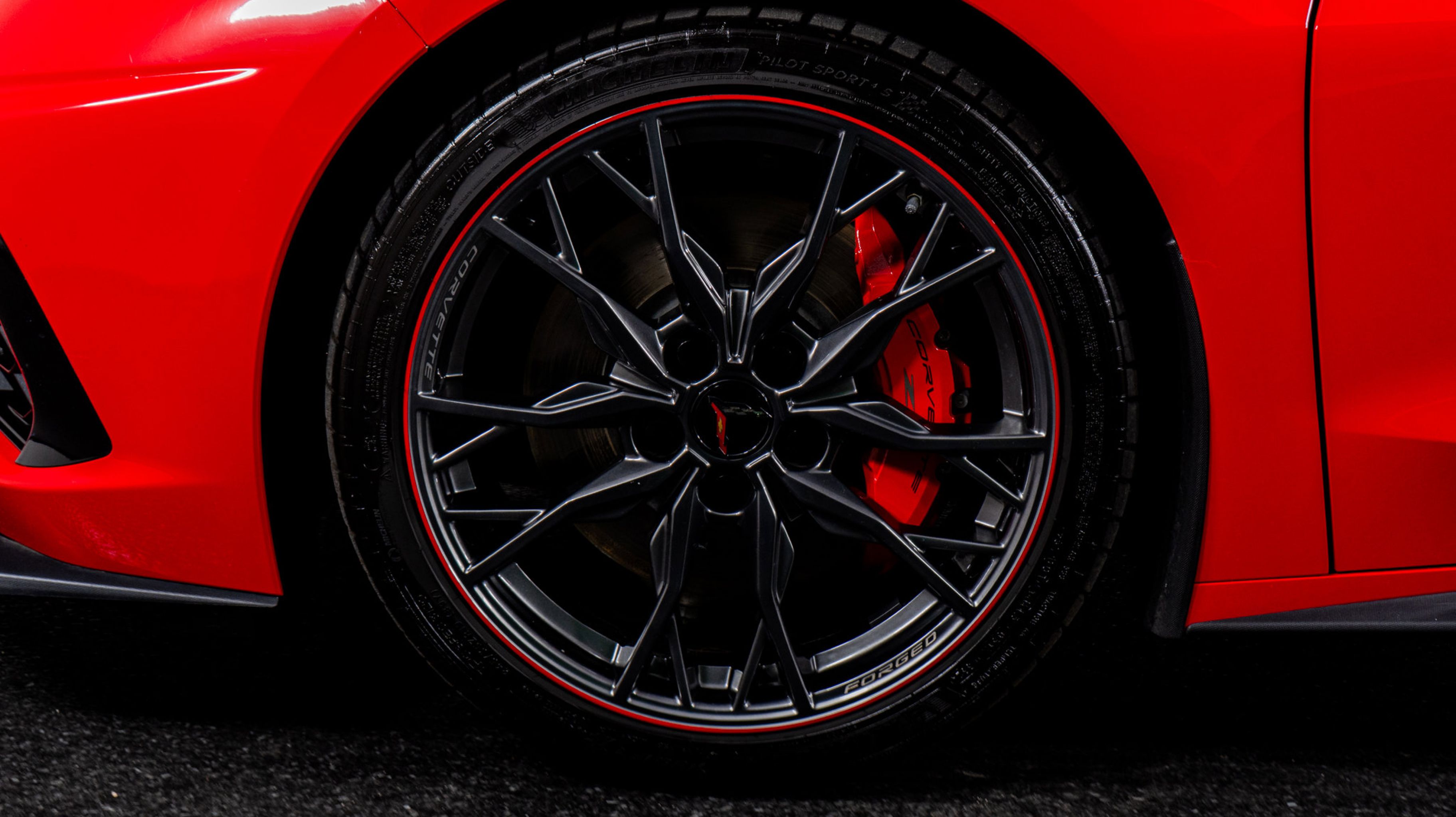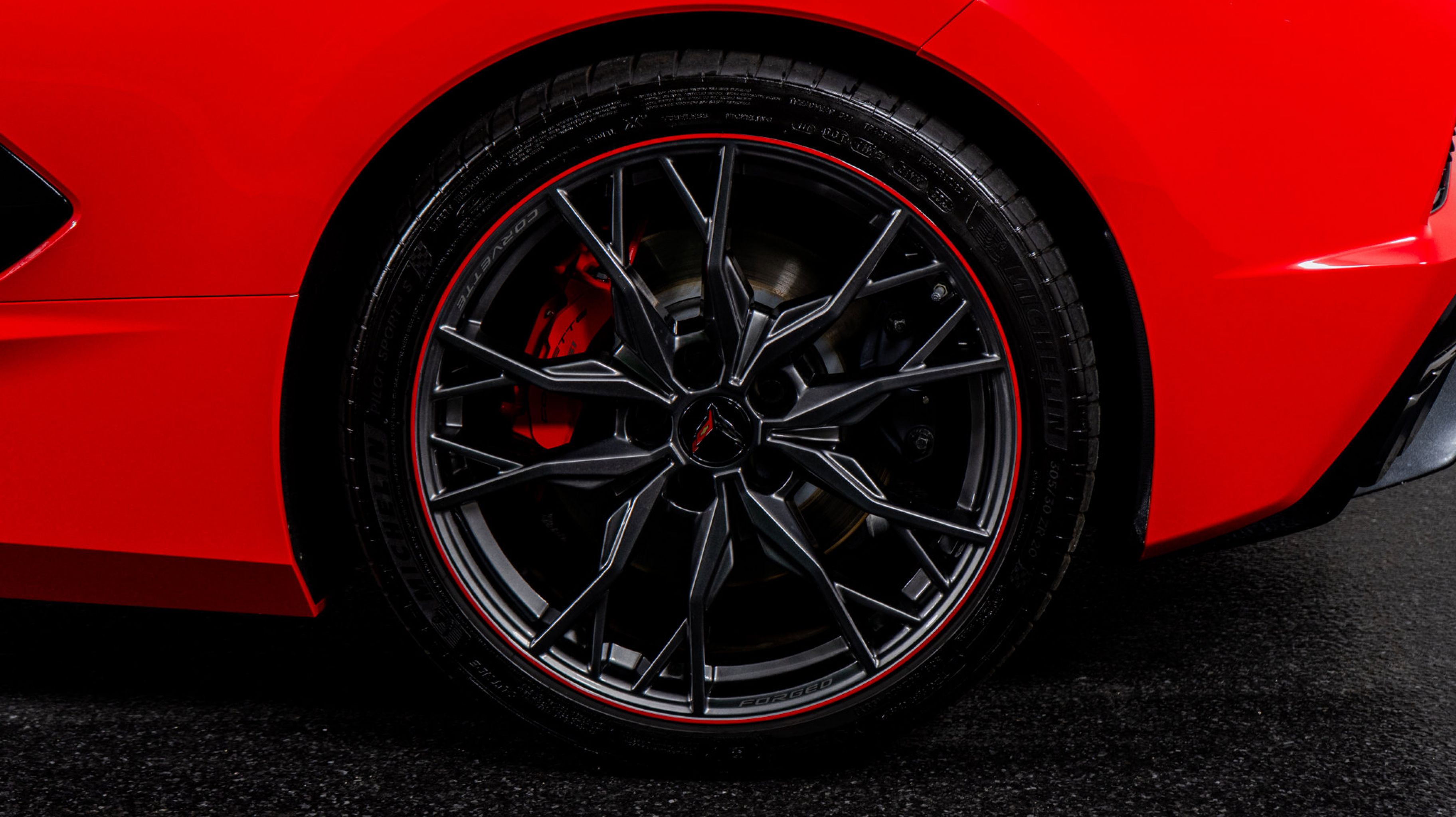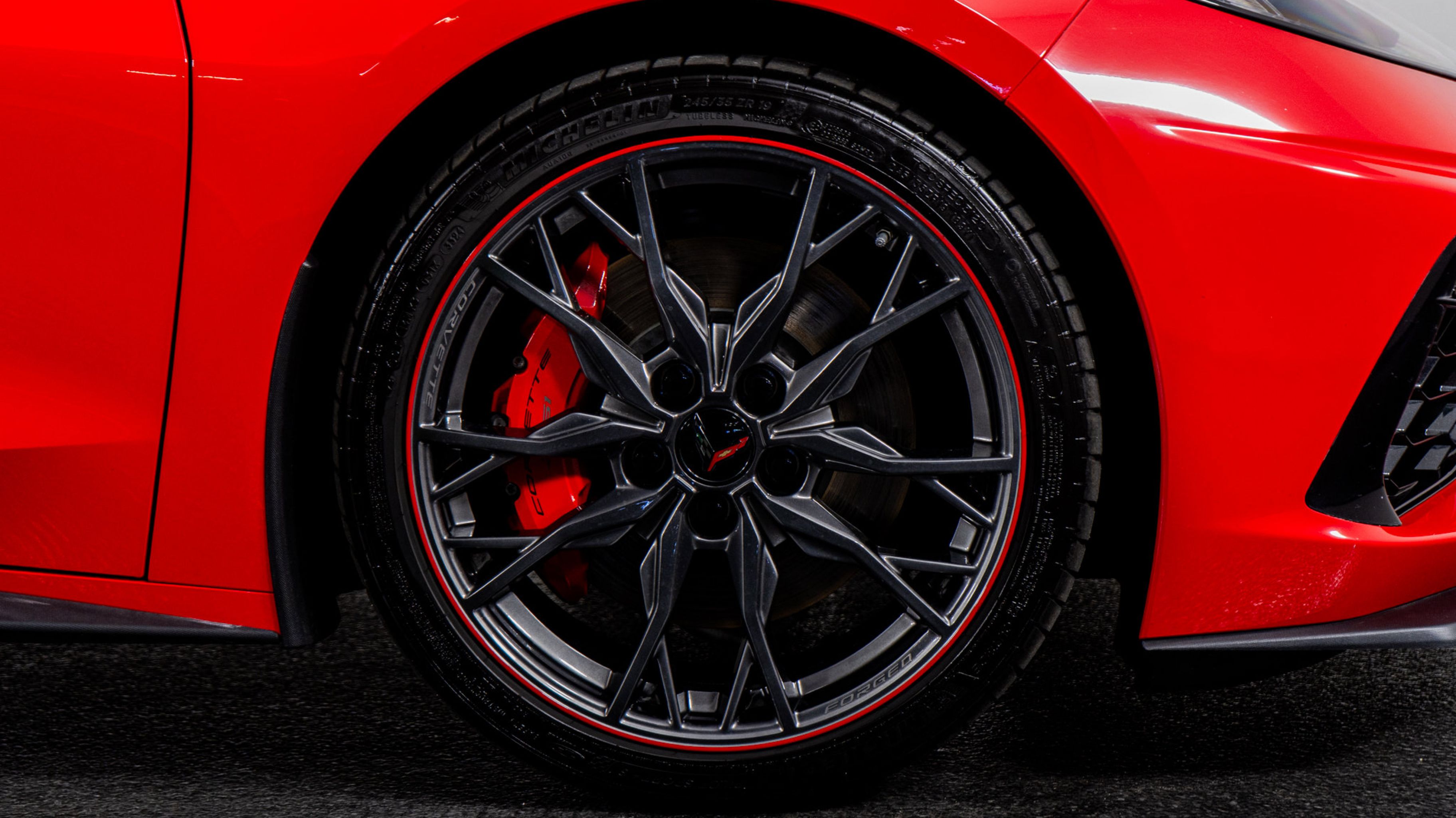 - WHEELS 19 X 8.5 (48.3 CM X 21.6 CM) FRONT AND 20 X 11 (50.8 CM X 27.9 CM) REAR 20-SPOKE MIDNIGHT GRAY FORGED ALUMINUM WITH RED STRIPE