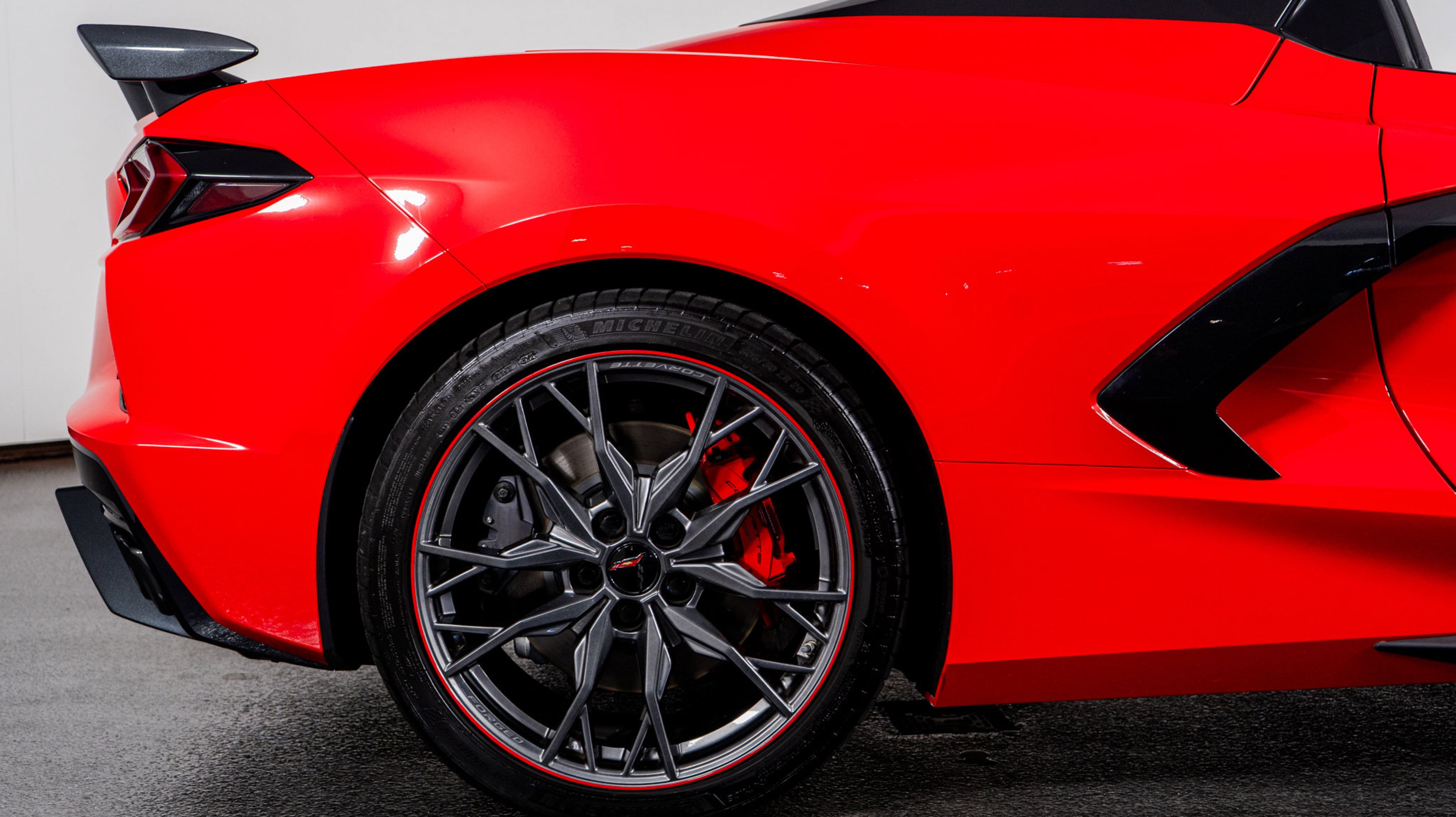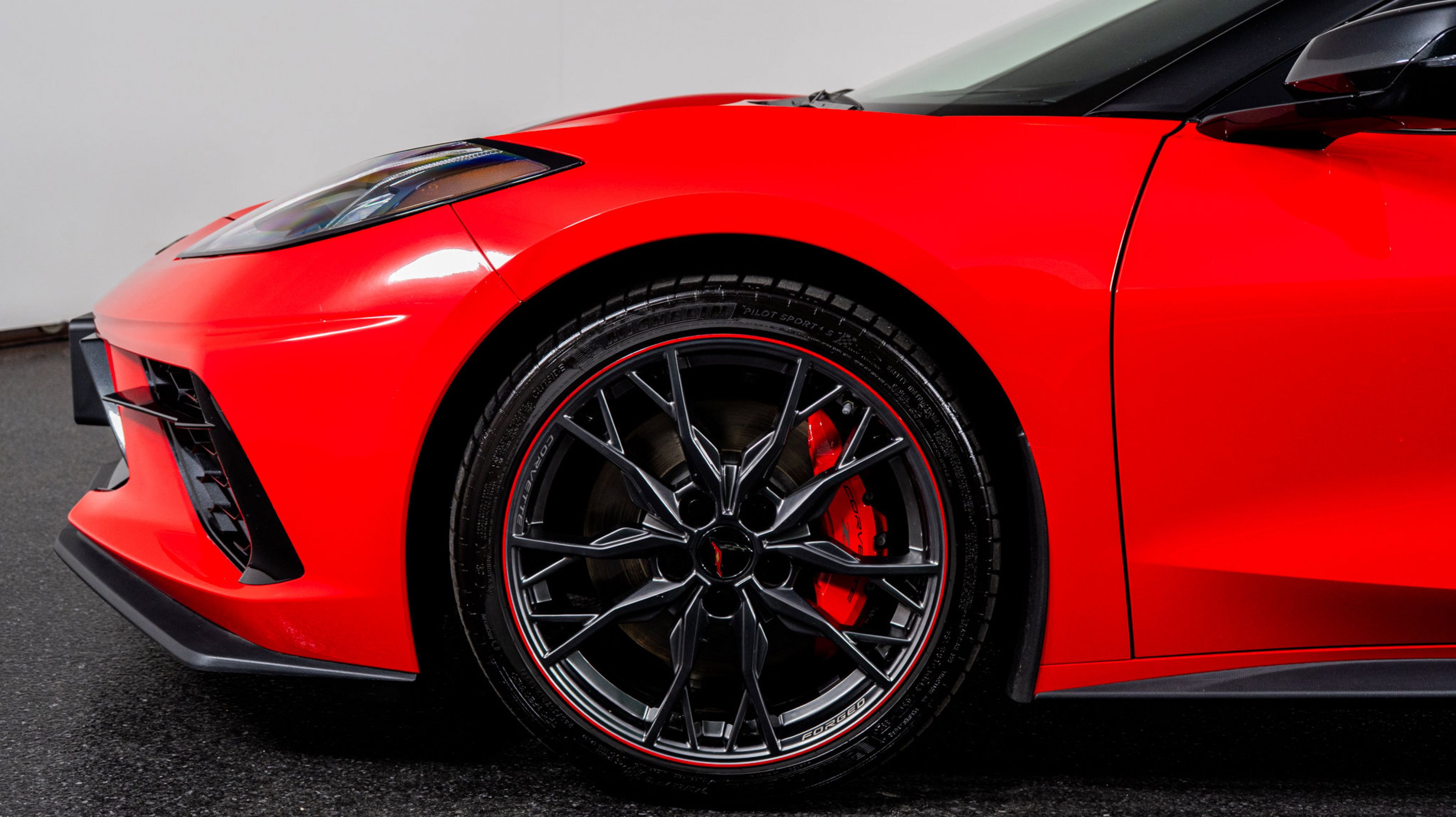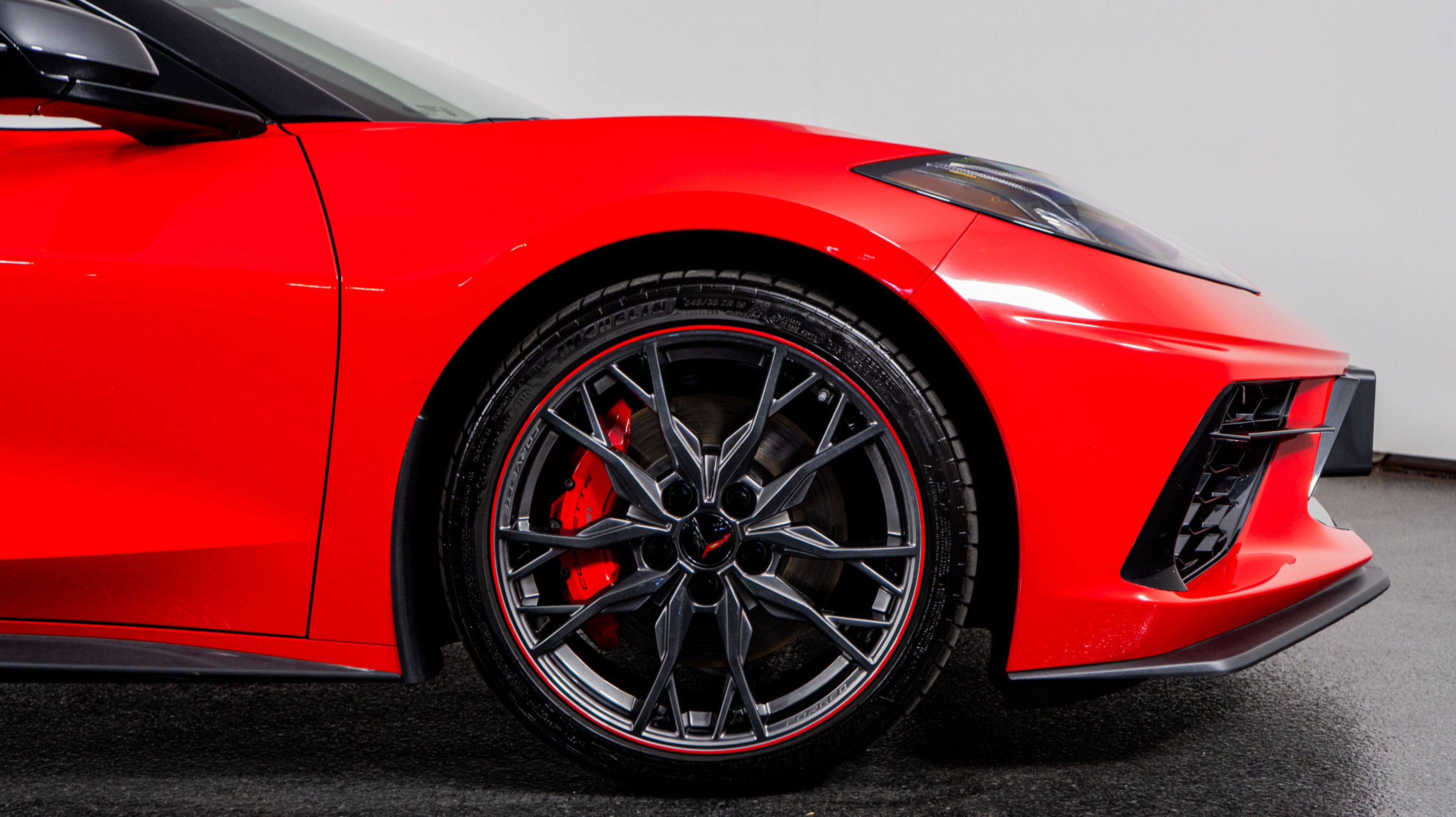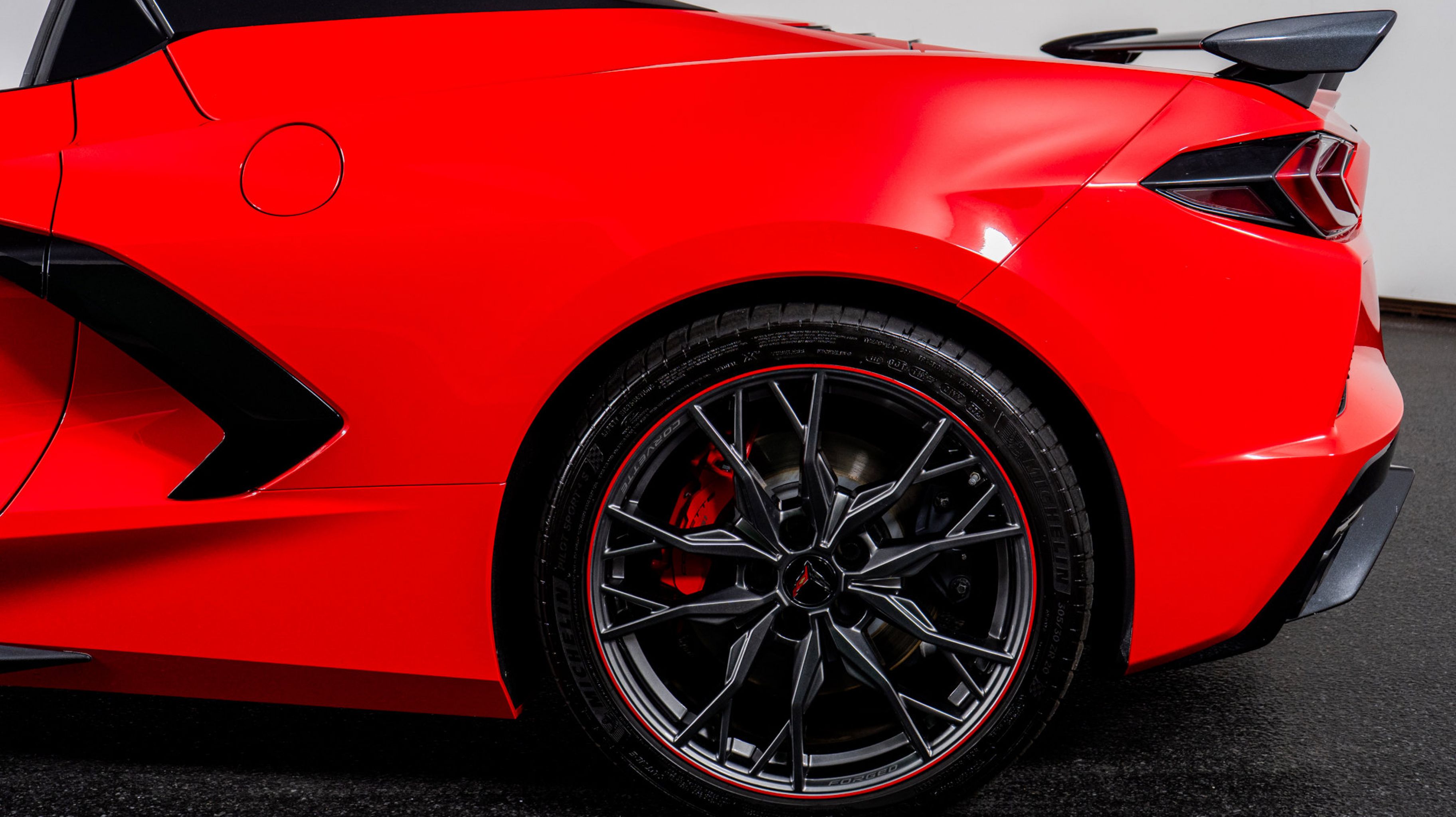 - WHEELS 19 X 8.5 (48.3 CM X 21.6 CM) FRONT AND 20 X 11 (50.8 CM X 27.9 CM) REAR 20-SPOKE MIDNIGHT GRAY FORGED ALUMINUM WITH RED STRIPE