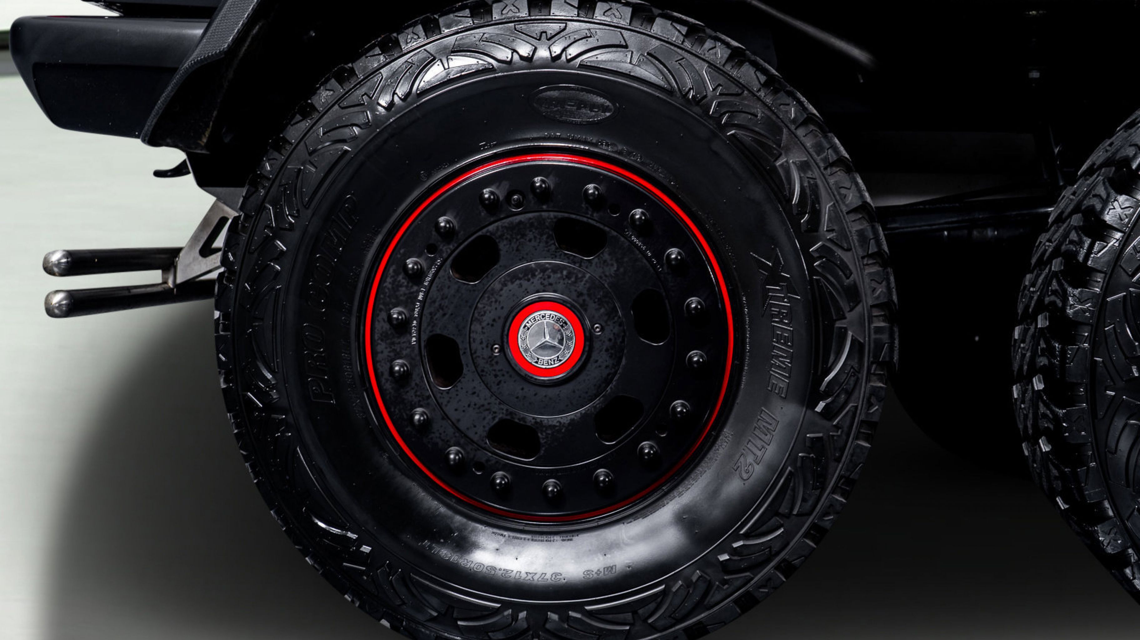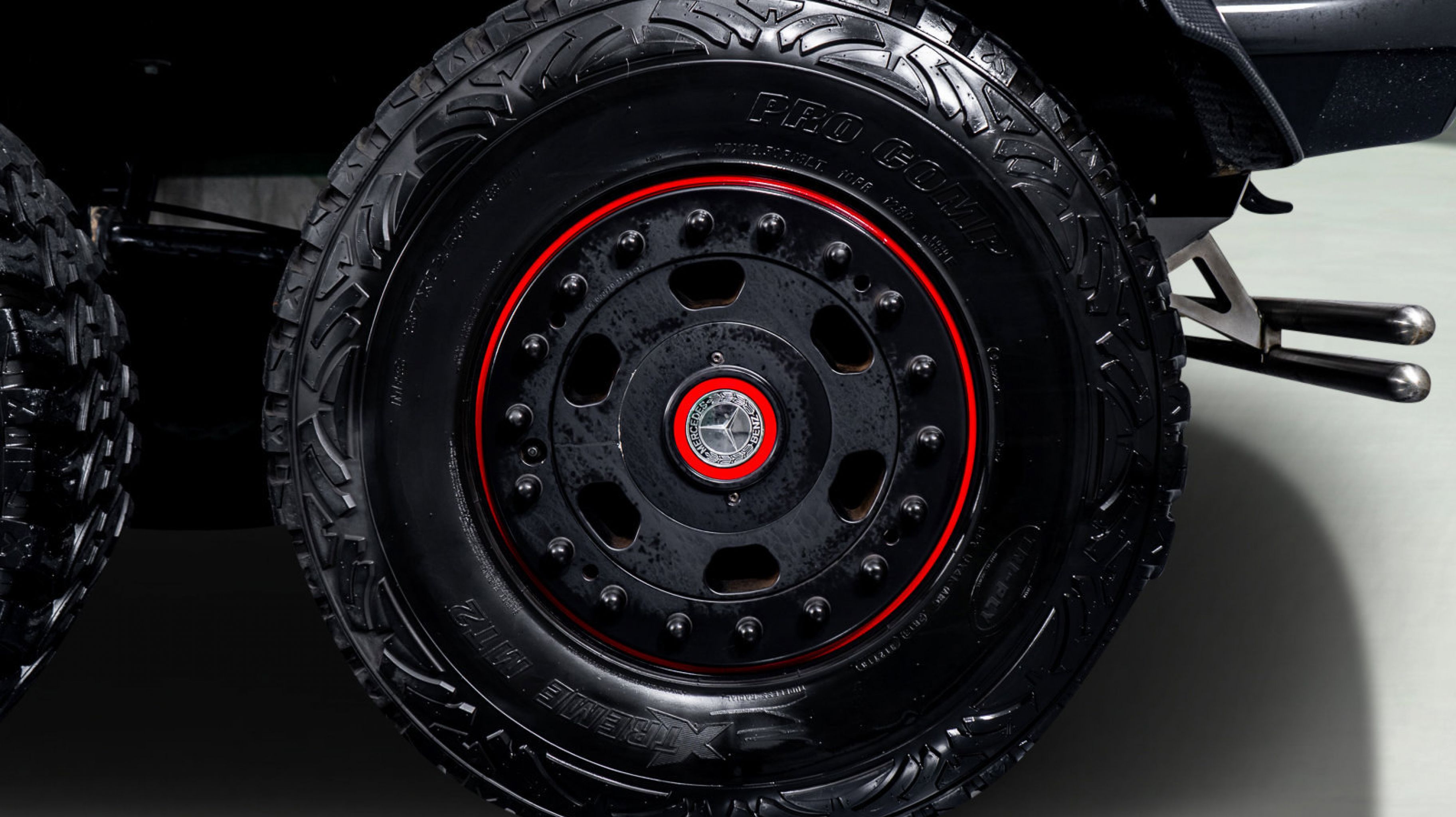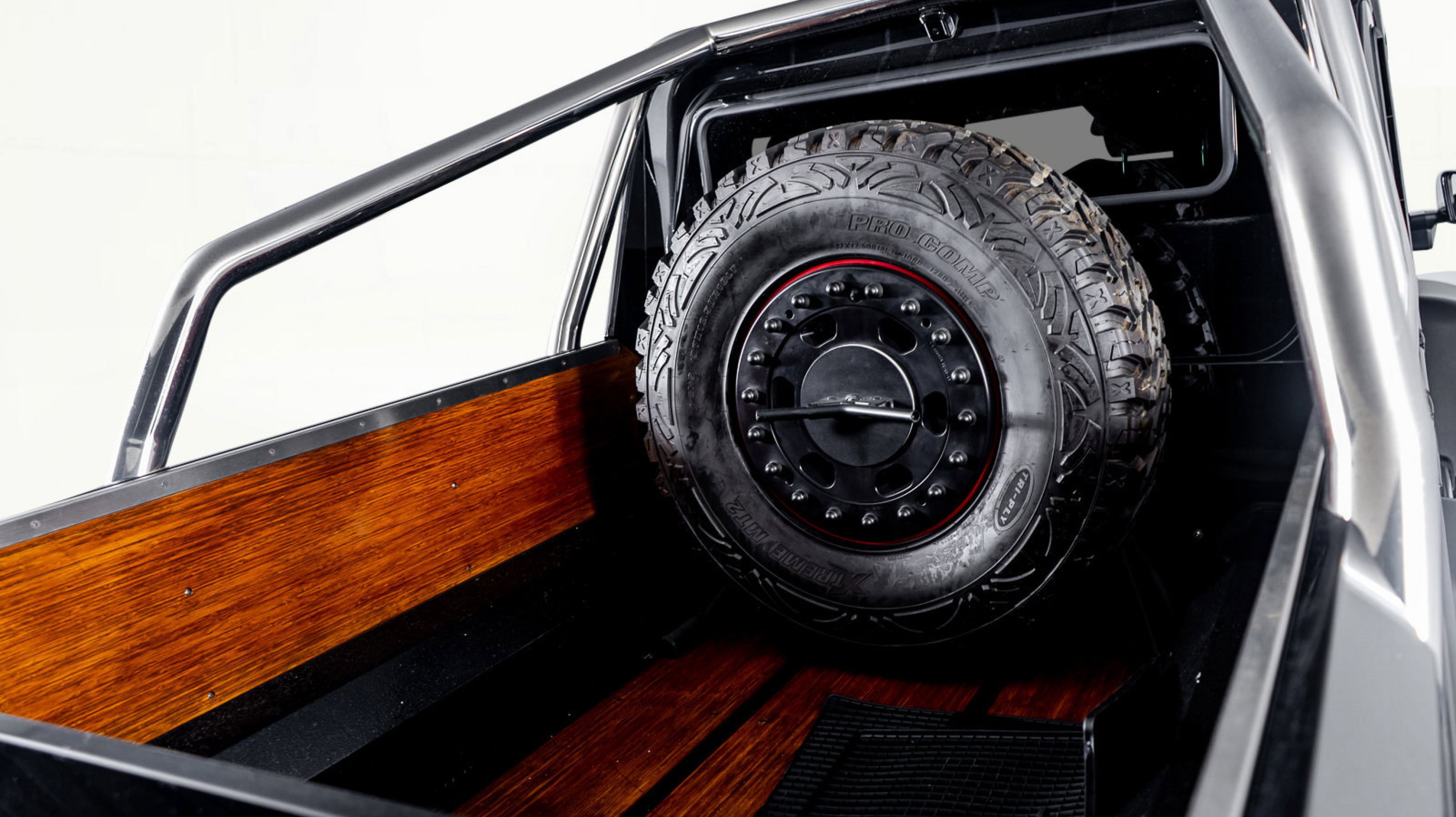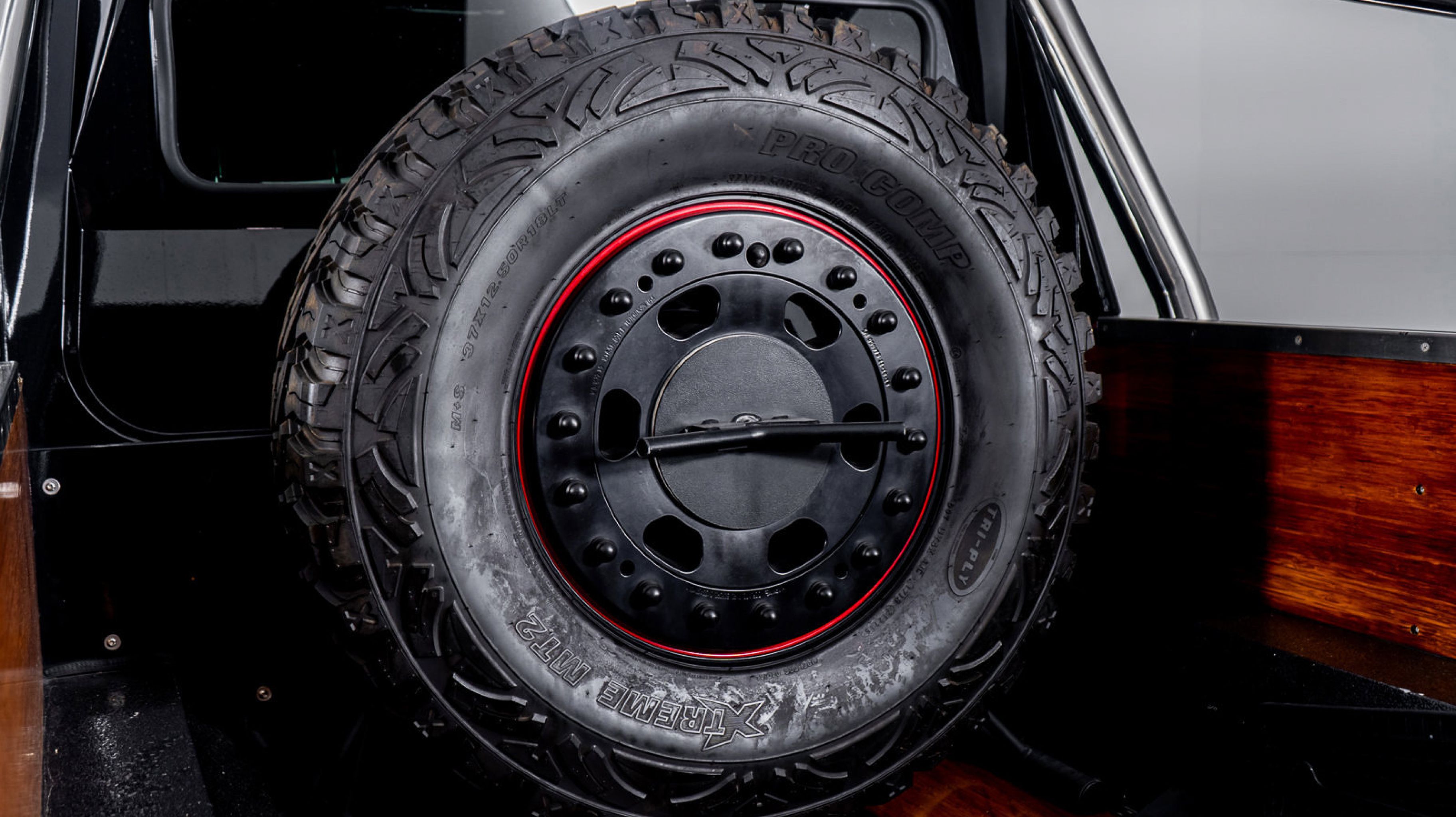 *** 18 Mercedes-Benz/Hutchinson Beadlock Wheels Mounted with 37 12.5 Pro Comp Extreme MT2 tires, including a spare mounted in the wood-paneled cargo bed