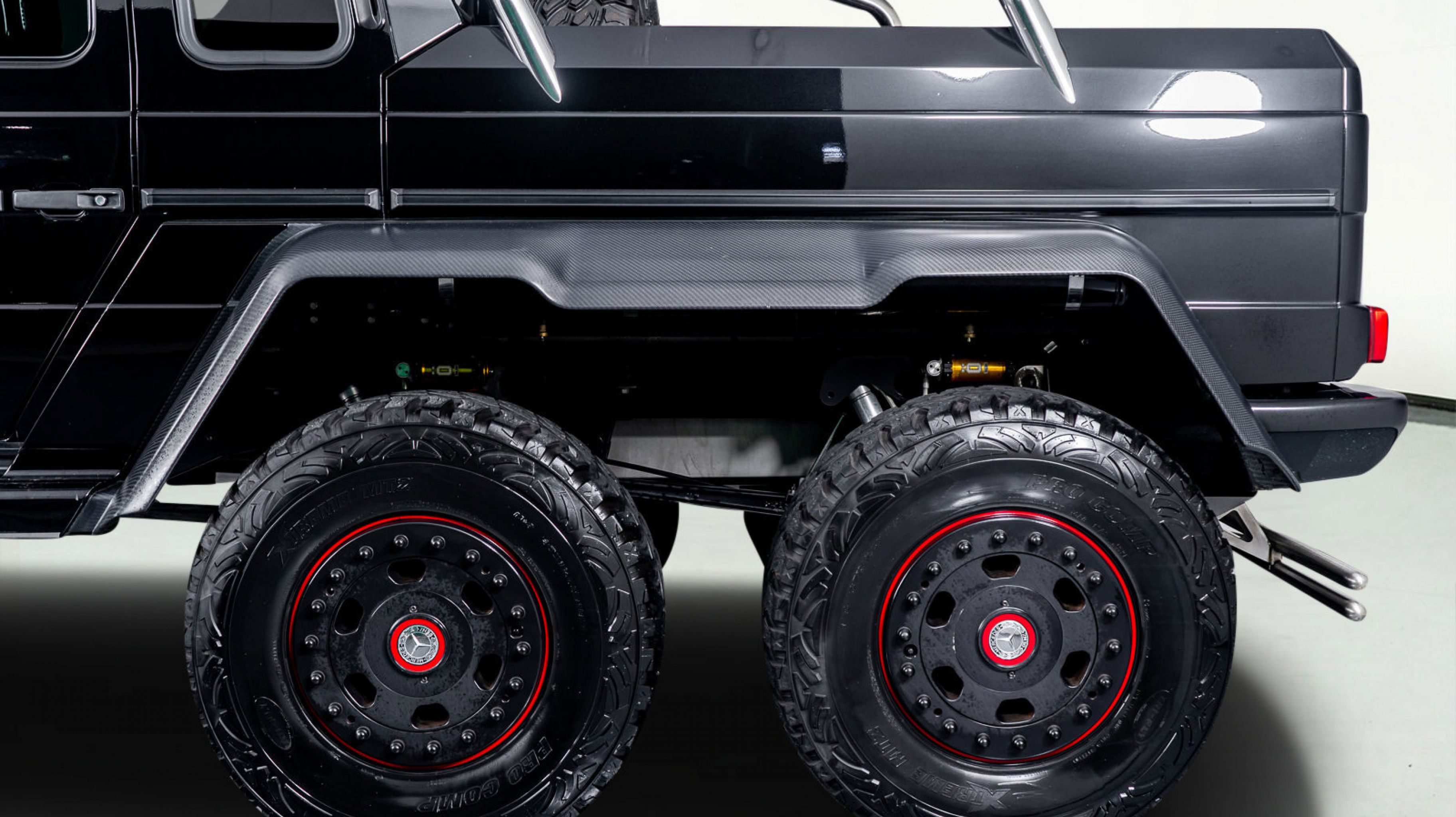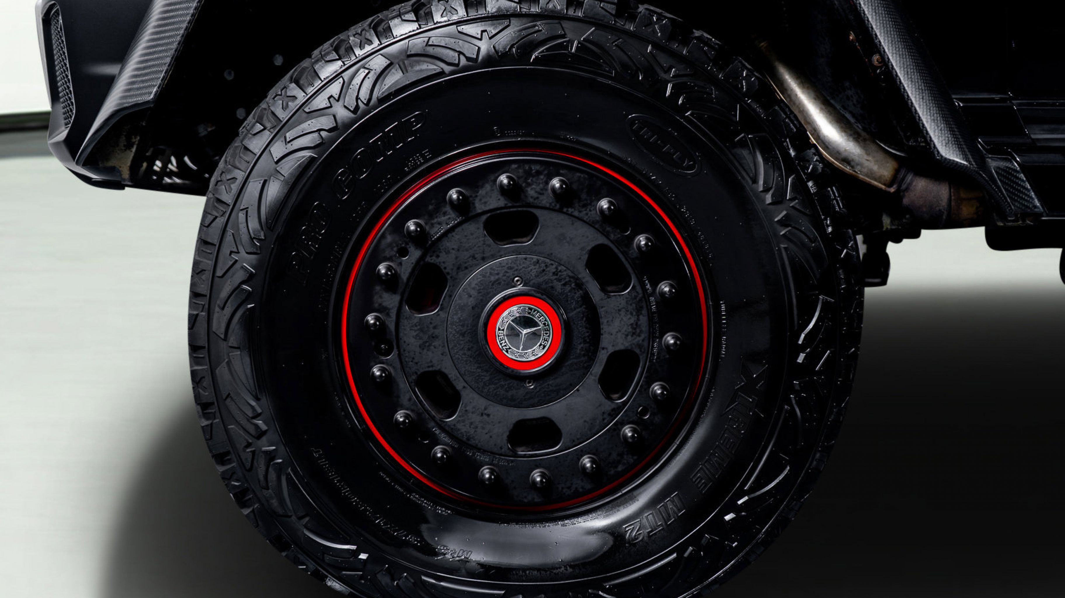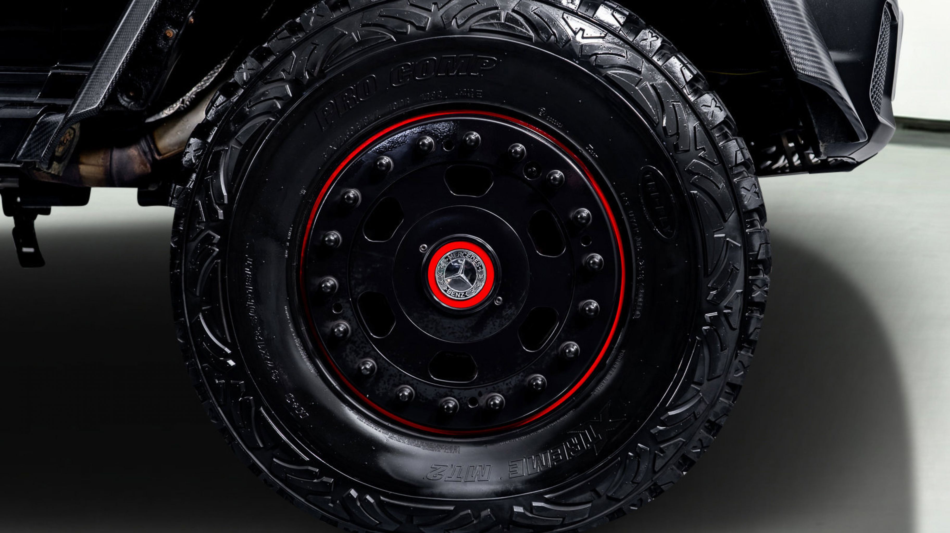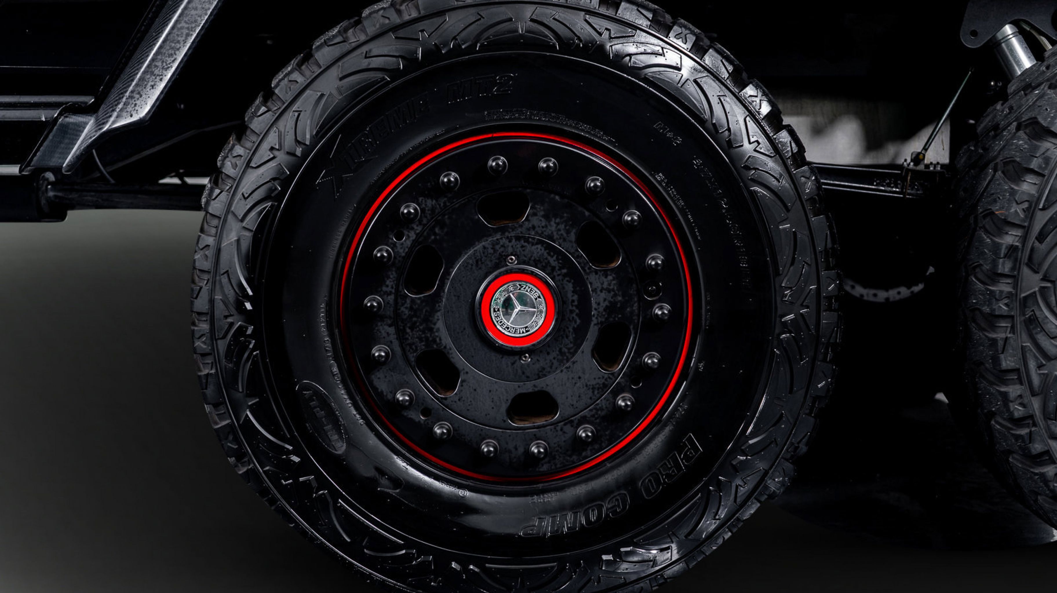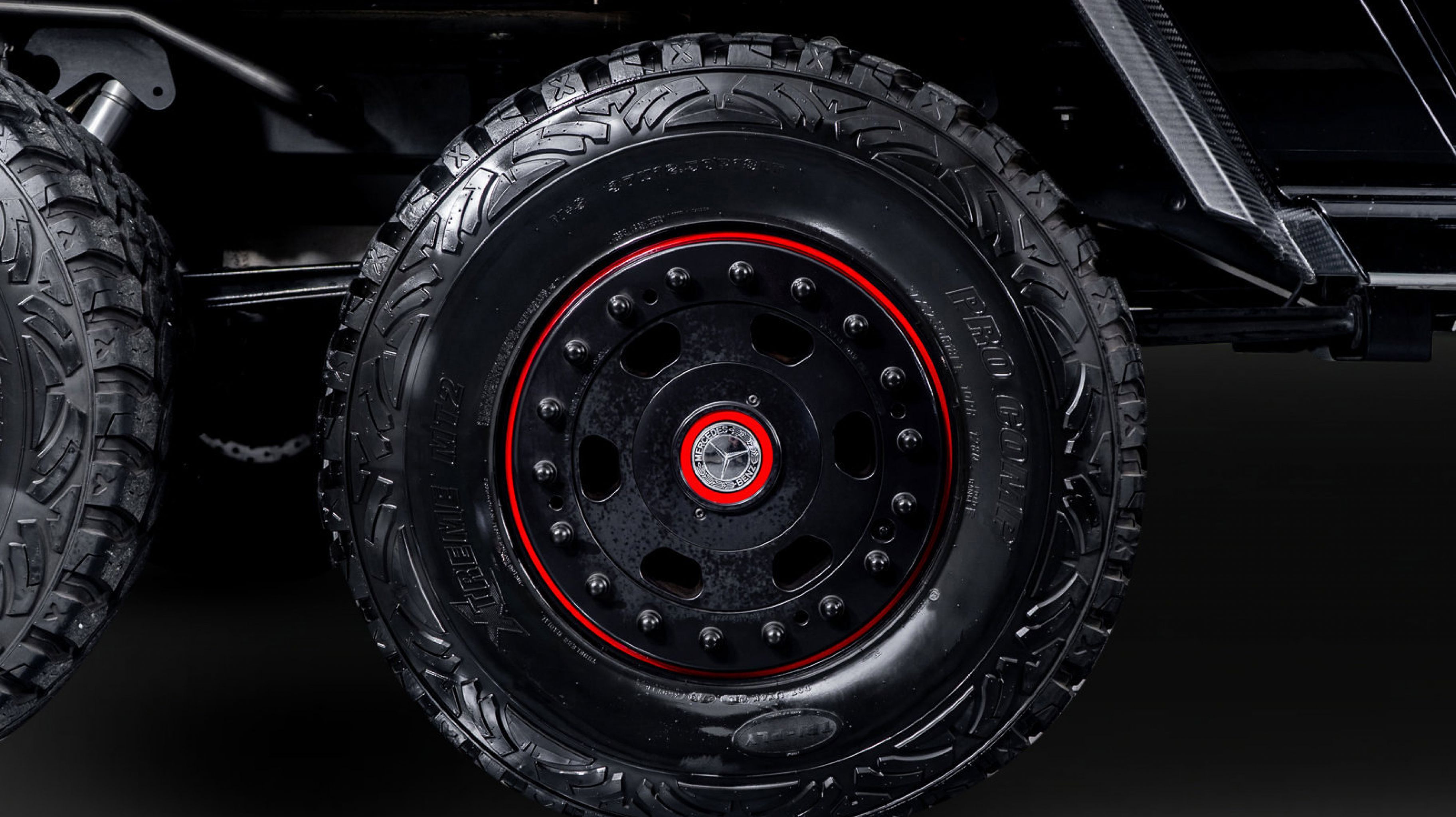 *** 18 Mercedes-Benz/Hutchinson Beadlock Wheels Mounted with 37 12.5 Pro Comp Extreme MT2 tires, including a spare mounted in the wood-paneled cargo bed